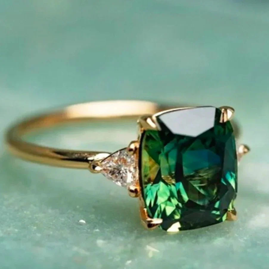 The Faye Ring is a stunning fusion of timeless beauty and bold sophistication, featuring a vibrant green zirconia stone set in a gleaming gold band. With its deep, luxurious hue and sleek silhouette, Faye effortlessly elevates any outfit—whether worn solo or stacked for added drama.